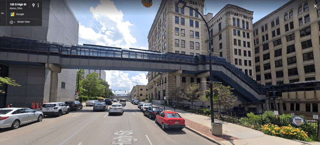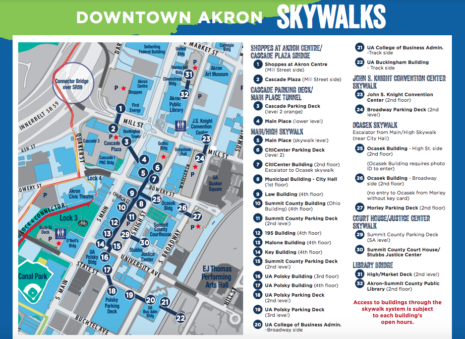 The above image might not describe every little detail of each skywalk’s architecture, but it sure is a helpful guide for navigating Akron’s useful skywalk system. Thanks to the Downtown Akron Partnership (otherwise known as DAP) these handy little guides can be found throughout the skywalks and in different buildings around town. Even if you aren’t coming from one of the buildings connected to the skywalk, you can easily hop onto it using one of the numbers on the map and head to where you need to go to avoid the brutal northeast Ohio winter.
